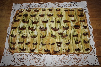 Crujiente y sabrosa masa recubierta de pequeñas migas de bacalao, sobre este se colocan las finas rebanadas de calabacÃn una a una, acompañándolo de trocitos de champiñón que consiguen una deliciosa mezcla de sabores al cocerse lentamente en el horno. Este formato es el más grande perfecto para dividirlo en unas 15 porciones.