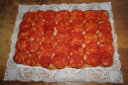 Crujiente y sabrosa masa recubierta de pequeñas migas de bacalao con finas rebanadas de tomate natural colocadas cuidadosamente una a una por encima. La mezcla se cuece en el horno lentamente para llegar al delicioso resultado final. Este formato es el más grande perfecto para dividirlo en unas 15 porciones.