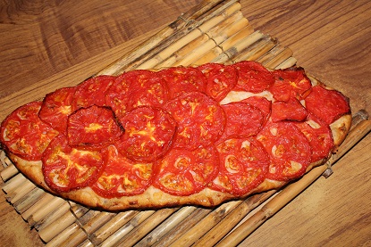 Crujiente y sabrosa masa recubierta de pequeñas migas de bacalao con finas rebanadas de tomate natural colocadas cuidadosamente una a una por encima. La mezcla se cuece en el horno lentamente para llegar al delicioso resultado final.