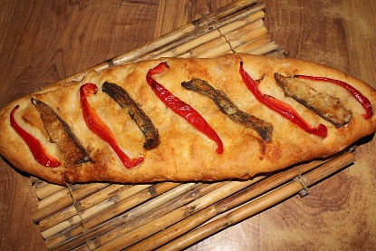 Crujiente masa elaborada y aplanada artesanalmente con trozos de sardina de bota alternados con trozos de pimentón que resultan una combinación de sabores perfecta tras su cocción en el horno.